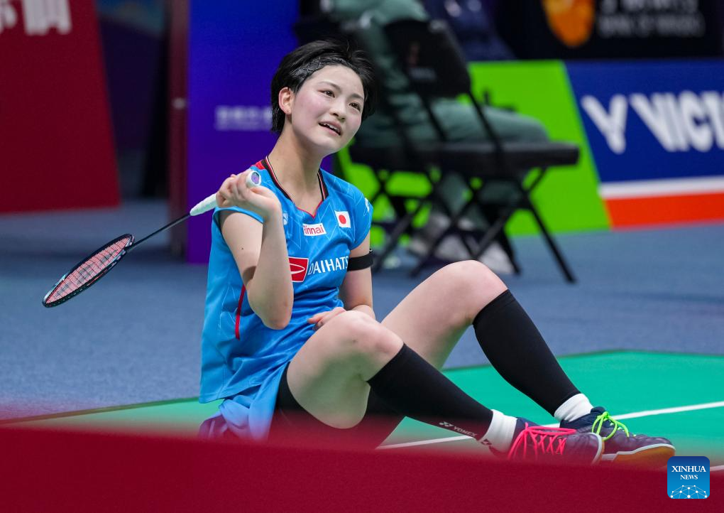 Miyazaki Tomoka of Japan reacts after the women's singles round of 16 match against Gao Fangjie of China at Badminton Asia Championships 2025 in Ningbo, east China's Zhejiang Province, April 10, 2025. (Xinhua/Sun Fei)