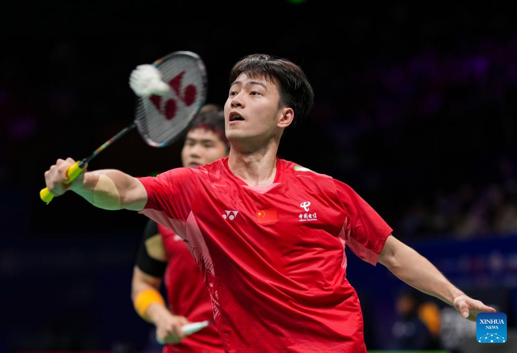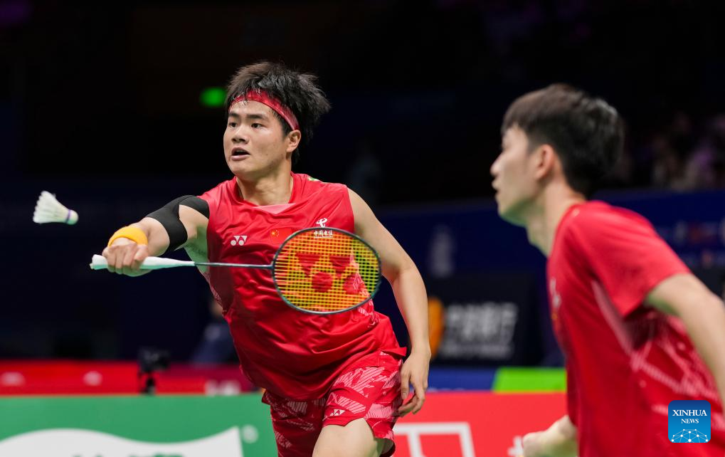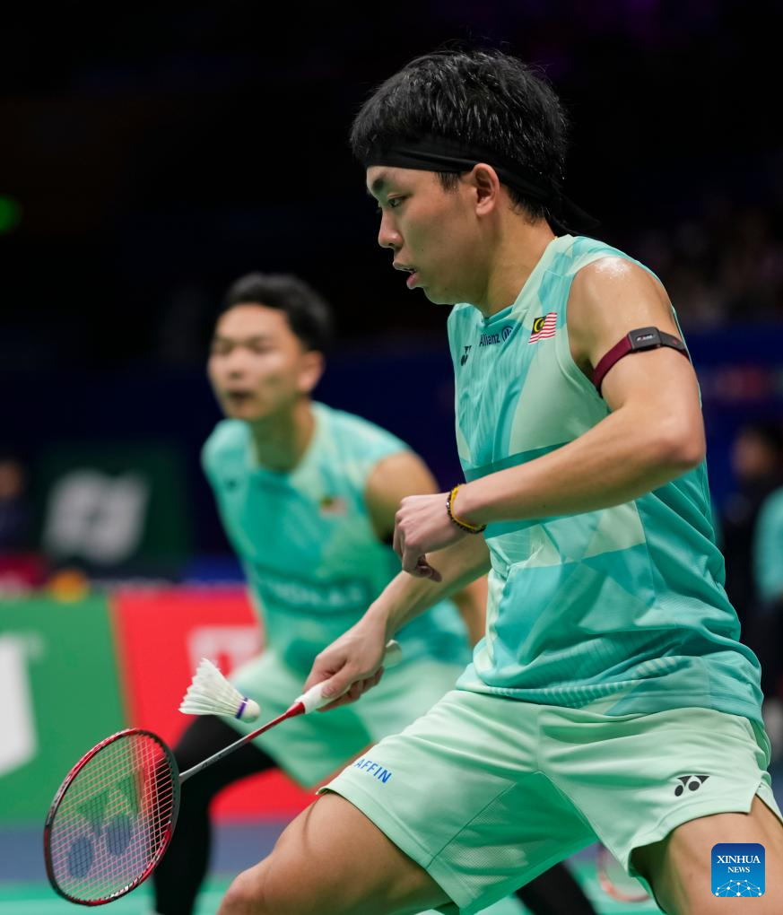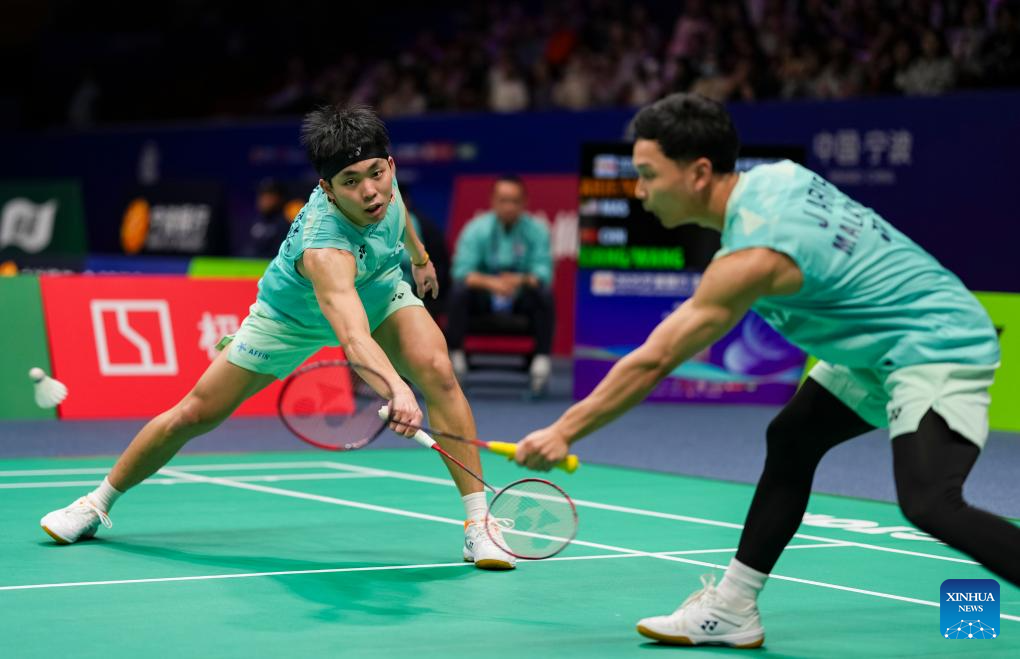 Liang Weikeng (L)/Wang Chang of China compete during the men's doubles round of 16 match against Junaidi Arif/Roy King Yap of Malaysia at Badminton Asia Championships 2025 in Ningbo, east China's Zhejiang Province, April 10, 2025. (Xinhua/Sun Fei)