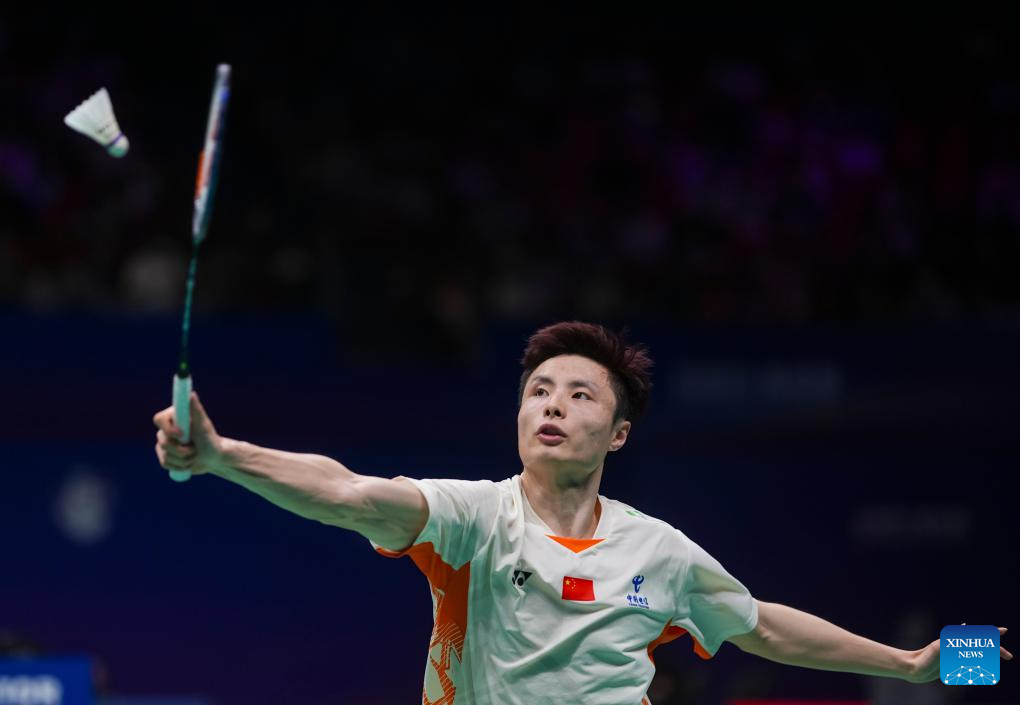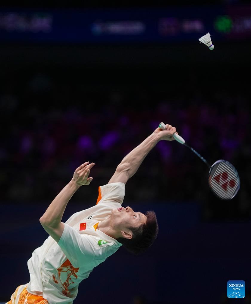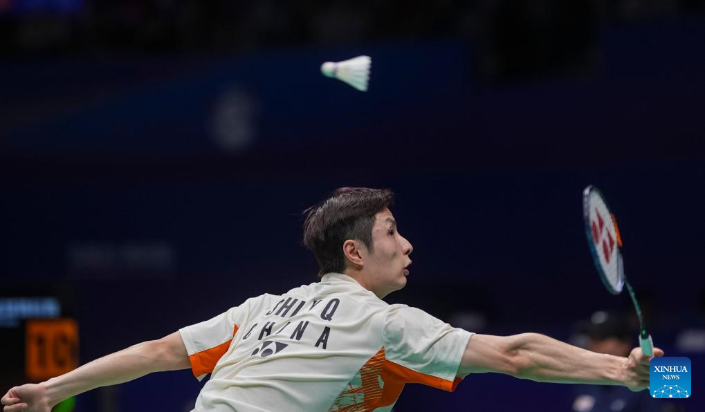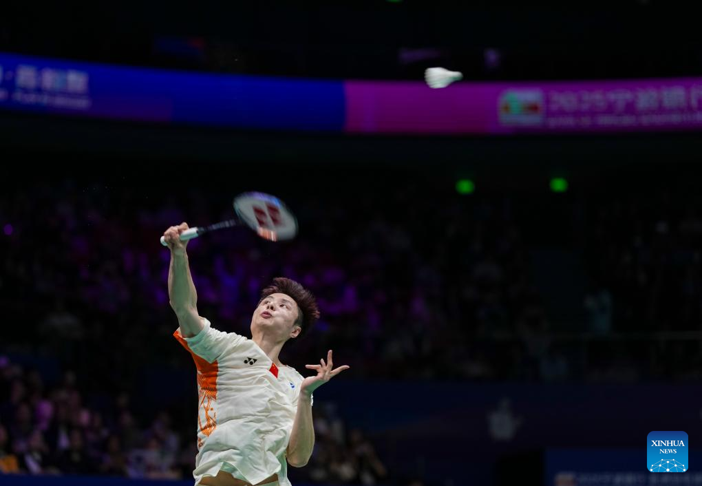 Shi Yuqi of China hits a return during the men's singles round of 16 match against Tanaka Yushi of Japan at Badminton Asia Championships 2025 in Ningbo, east China's Zhejiang Province, April 10, 2025. (Xinhua/Sun Fei)