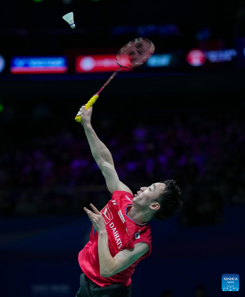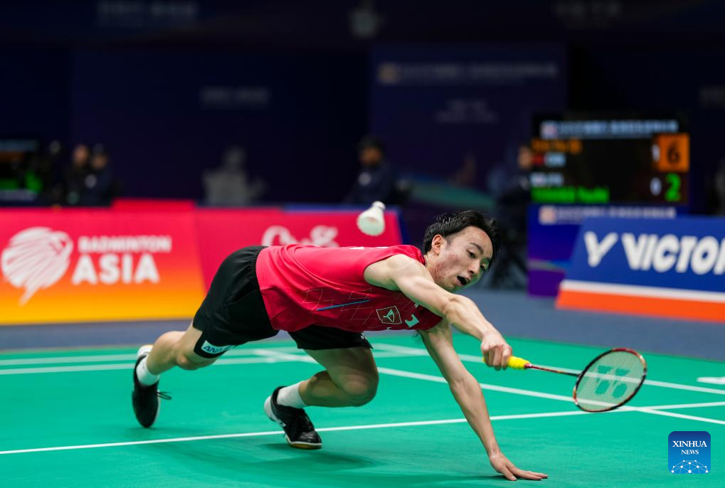 Tanaka Yushi of Japan hits a return during the men's singles round of 16 match against Shi Yuqi of China at Badminton Asia Championships 2025 in Ningbo, east China's Zhejiang Province, April 10, 2025. (Xinhua/Sun Fei)