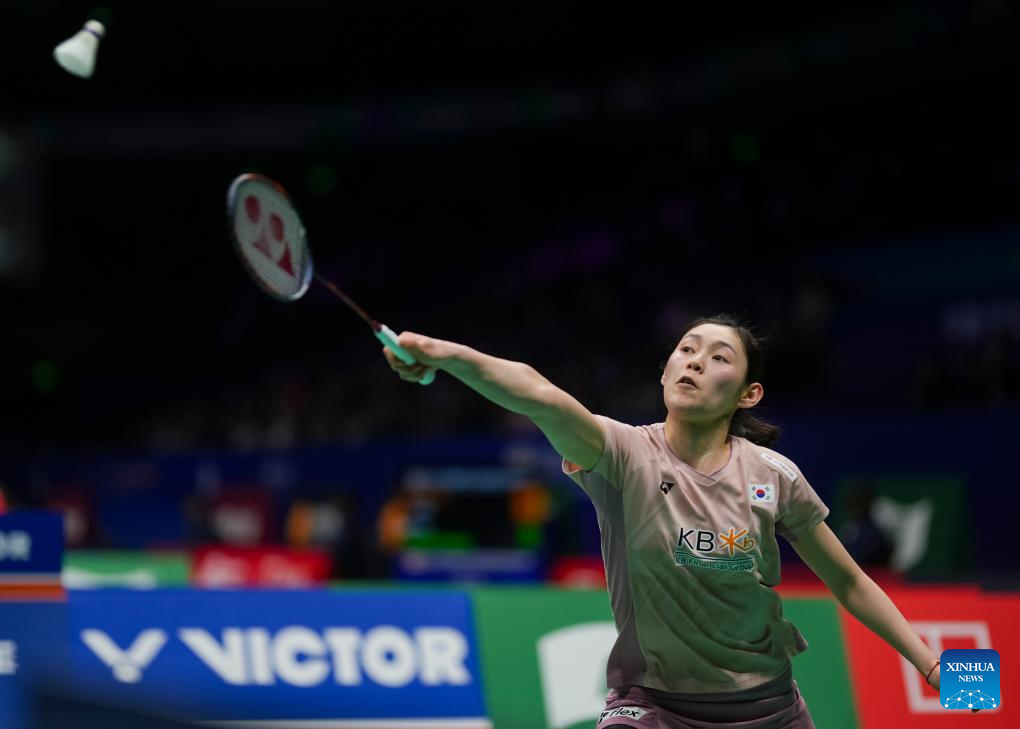 Sim Yu Jin of South Korea hits a return during the women's singles round of 16 match against Wang Zhiyi of China at Badminton Asia Championships 2025 in Ningbo, east China's Zhejiang Province, April 10, 2025. (Xinhua/Sun Fei)