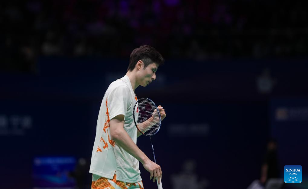 Shi Yuqi of China celebrates a point during the men's singles round of 16 match against Tanaka Yushi of Japan at Badminton Asia Championships 2025 in Ningbo, east China's Zhejiang Province, April 10, 2025. (Xinhua/Sun Fei)