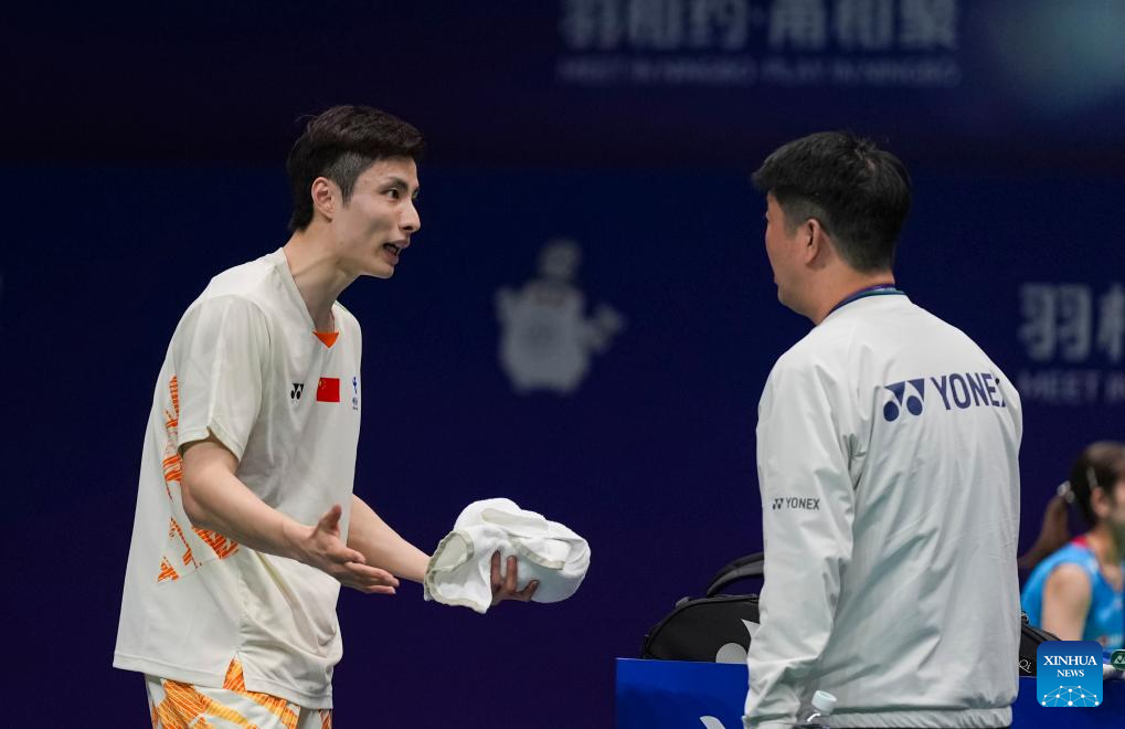 Shi Yuqi (L) of China communicates with his coach Sun Jun during the men's singles round of 16 match against Tanaka Yushi of Japan at Badminton Asia Championships 2025 in Ningbo, east China's Zhejiang Province, April 10, 2025. (Xinhua/Sun Fei)