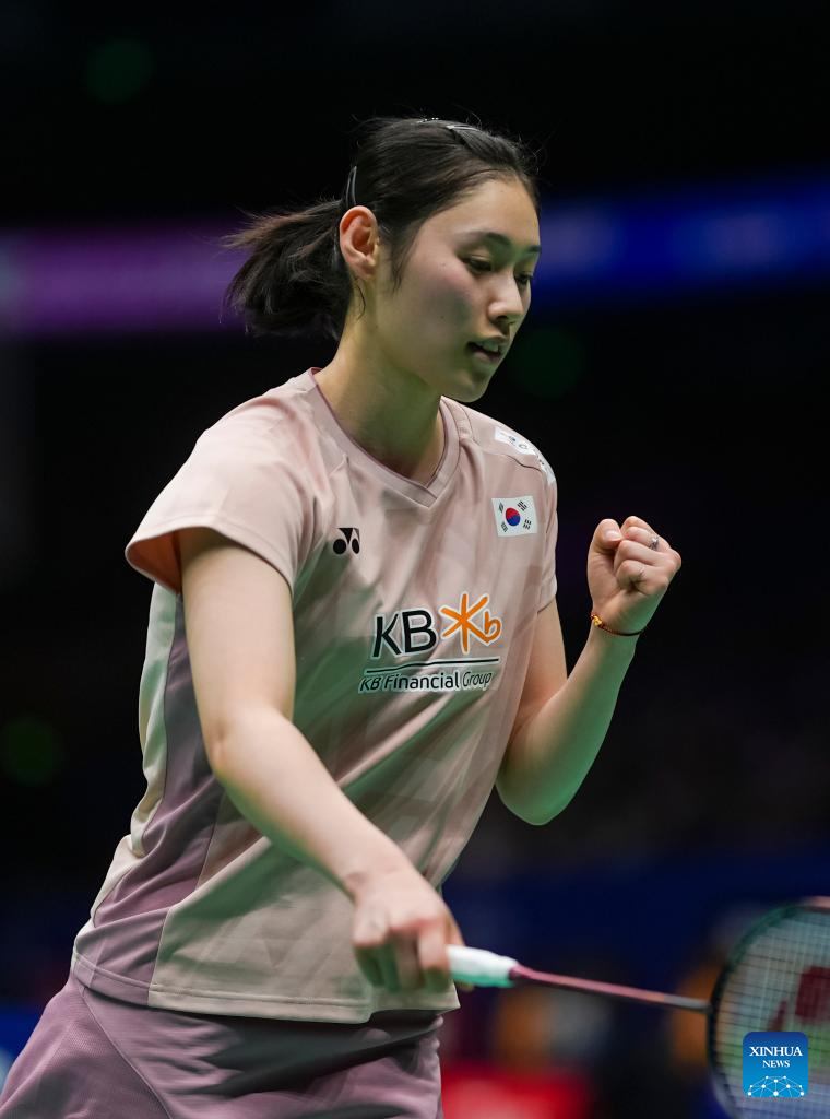 Sim Yu Jin of South Korea celebrates scoring during the women's singles round of 16 match against Wang Zhiyi of China at Badminton Asia Championships 2025 in Ningbo, east China's Zhejiang Province, April 10, 2025. (Xinhua/Sun Fei)