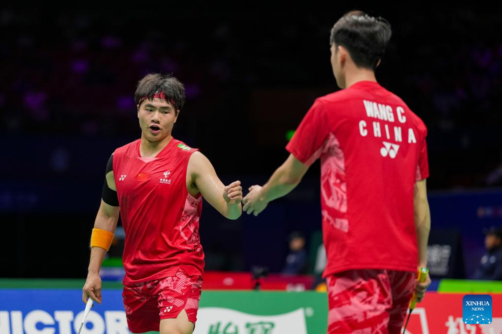 Liang Weikeng (L)/Wang Chang of China celebrate scoring during the men's doubles round of 16 match against Junaidi Arif/Roy King Yap of Malaysia at Badminton Asia Championships 2025 in Ningbo, east China's Zhejiang Province, April 10, 2025. (Xinhua/Sun Fei)