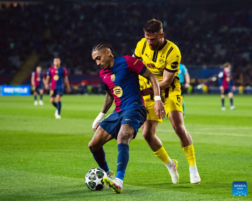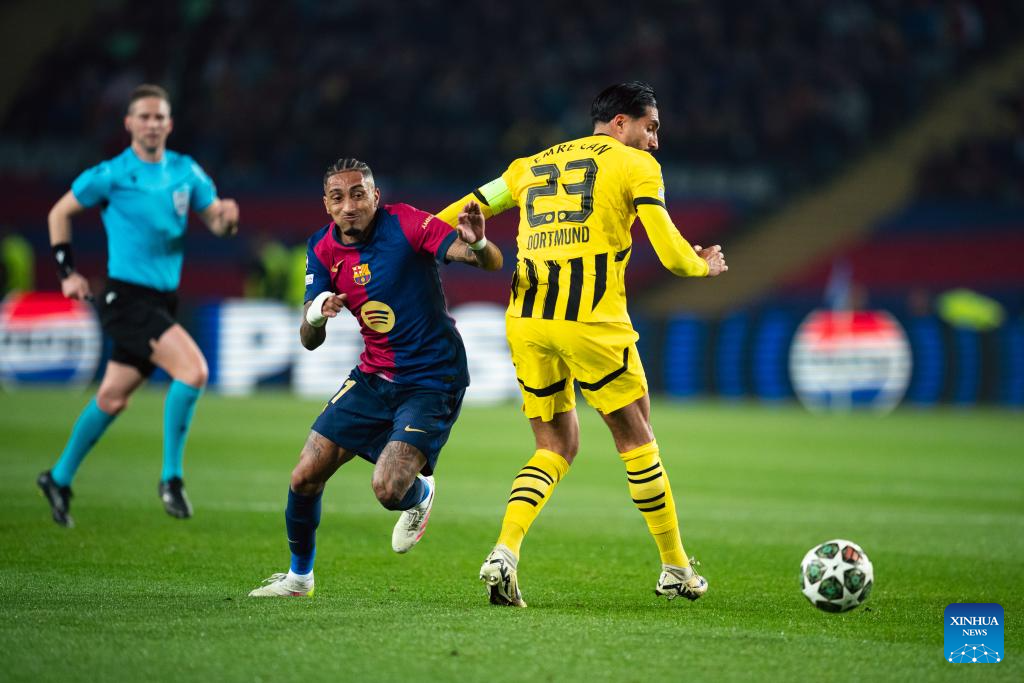 Raphinha (L) of FC Barcelona vies with Salih Ozcan of Borussia Dortmund during the UEFA Champions League quarterfinal 1st leg football match between FC Barcelona and Borussia Dortmund in Barcelona, Spain, on April 9, 2025. (Photo by Joan Gosa/Xinhua)