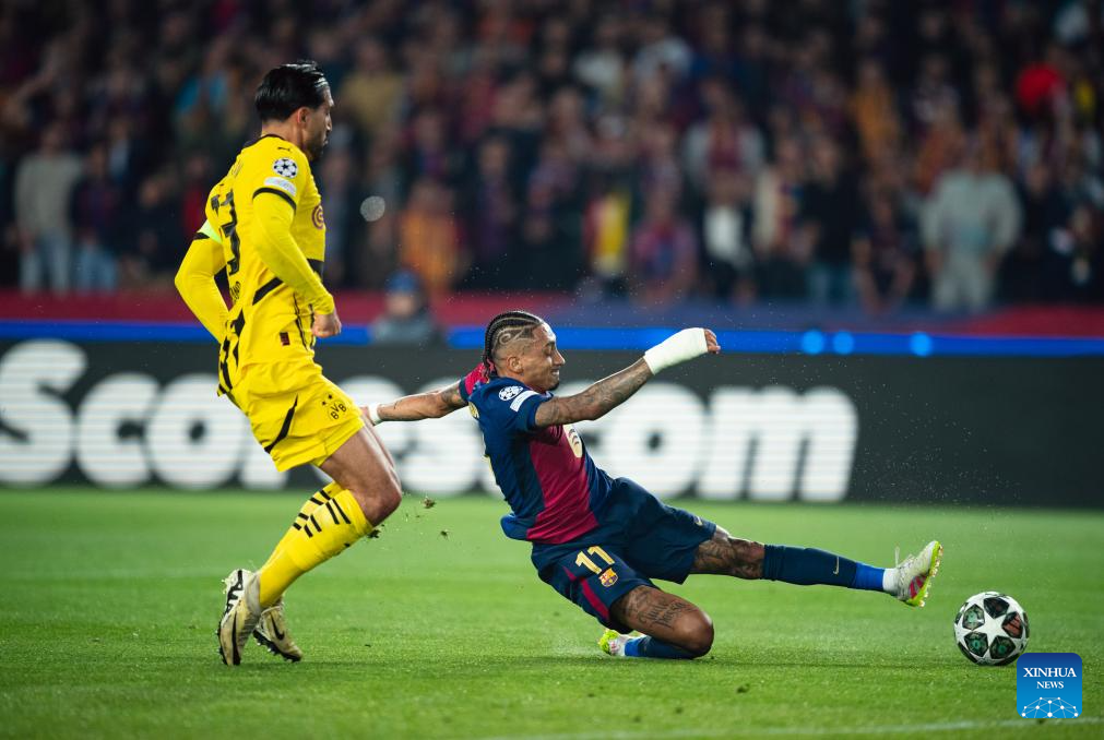 Raphinha (R) of FC Barcelona shoots to score during the UEFA Champions League quarterfinal 1st leg football match between FC Barcelona and Borussia Dortmund in Barcelona, Spain, on April 9, 2025. (Photo by Joan Gosa/Xinhua)