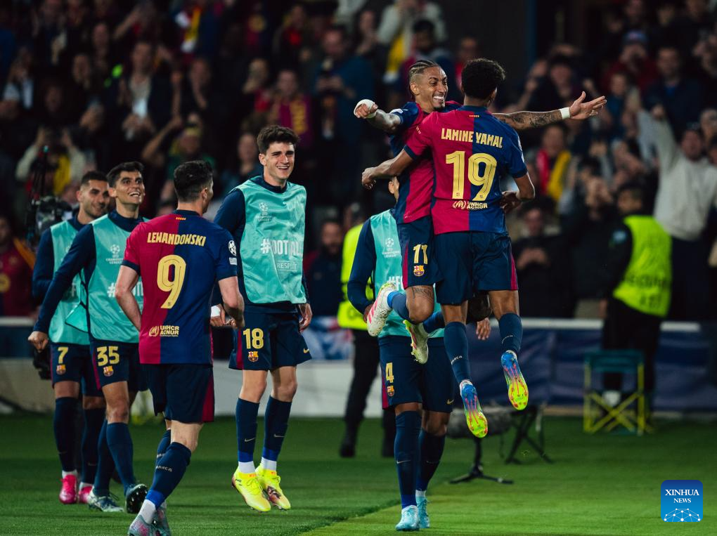 Lamine Yamal (top R) of FC Barcelona celebrates his goal with teammates during the UEFA Champions League quarterfinal 1st leg football match between FC Barcelona and Borussia Dortmund in Barcelona, Spain, on April 9, 2025. (Photo by Joan Gosa/Xinhua)