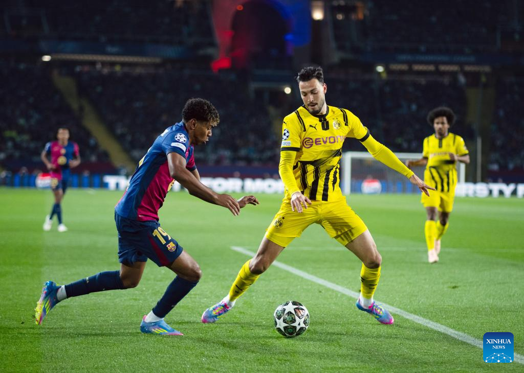 Lamine Yamal (L) of FC Barcelona vies with Ramy Bensebaini of Borussia Dortmund during the UEFA Champions League quarterfinal 1st leg football match between FC Barcelona and Borussia Dortmund in Barcelona, Spain, on April 9, 2025. (Photo by Joan Gosa/Xinhua)