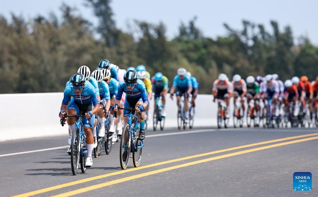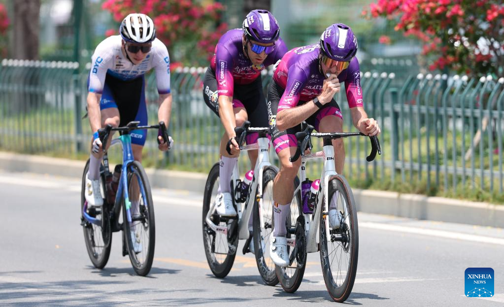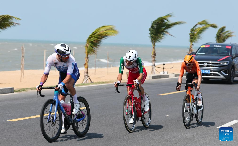Aaron Murray Gate (C) of XDS Astana Team competes during Stage 5 at the 16th Tour of Hainan cycling race from Dongfang to Sanya, south China's Hainan Province, April 11, 2025. (Xinhua/Yang Guanyu)