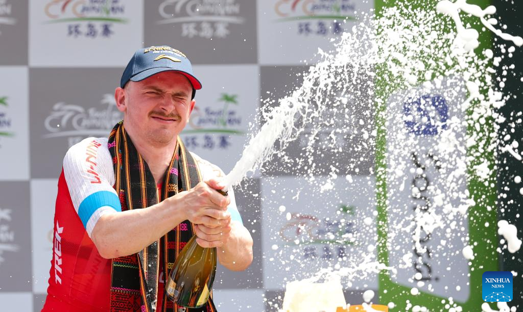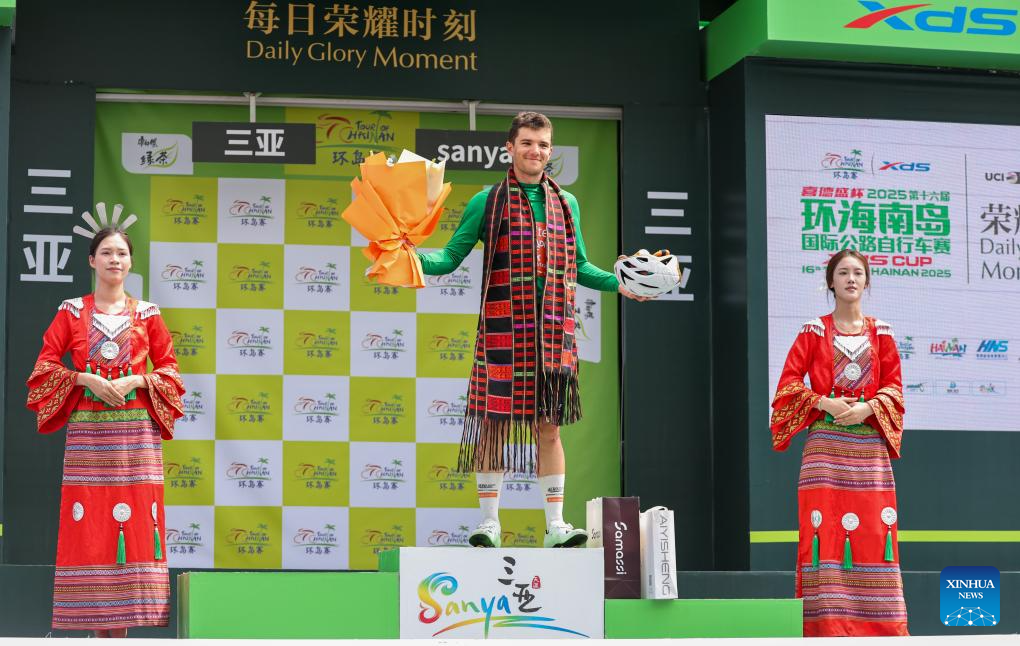 Alexander Salby of Li Ning Star celebrates during the awarding ceremony after Stage 5 at the 16th Tour of Hainan cycling race from Dongfang to Sanya, south China's Hainan Province, April 11, 2025. (Xinhua/Yang Guanyu)