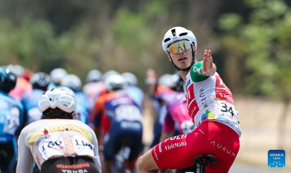 Andrea Pietrobon of Team Polti VisitMalta gestures during Stage 5 at the 16th Tour of Hainan cycling race from Dongfang to Sanya, south China's Hainan Province, April 11, 2025. (Xinhua/Yang Guanyu)