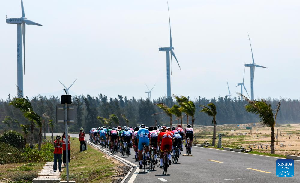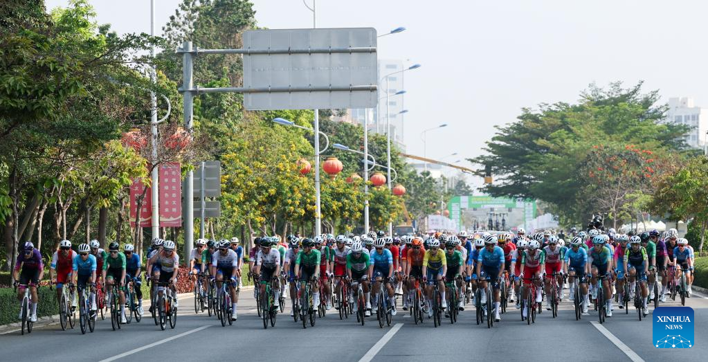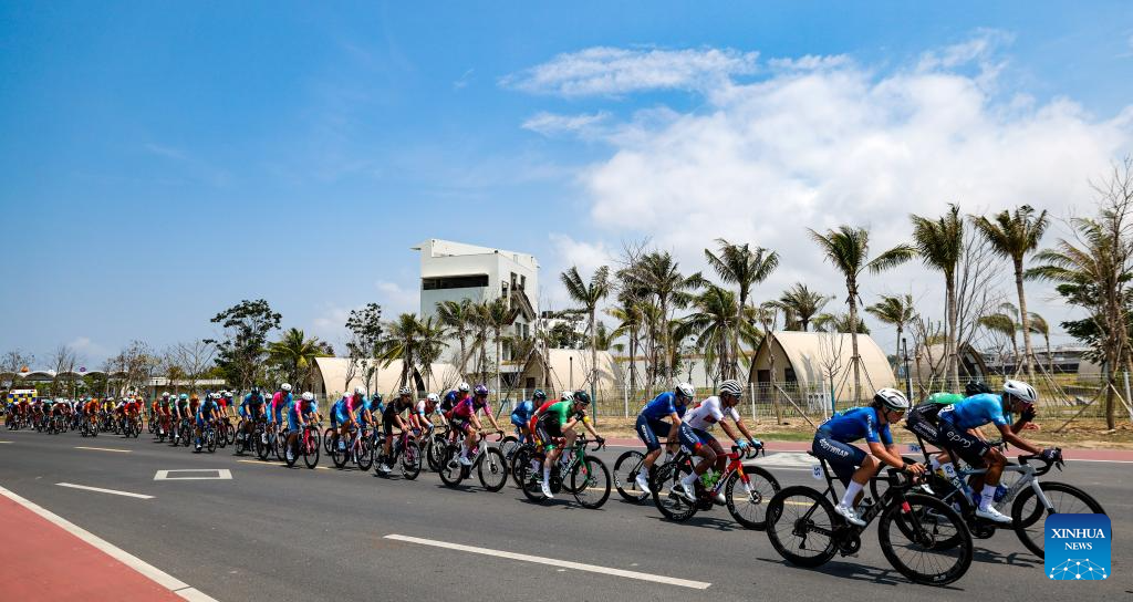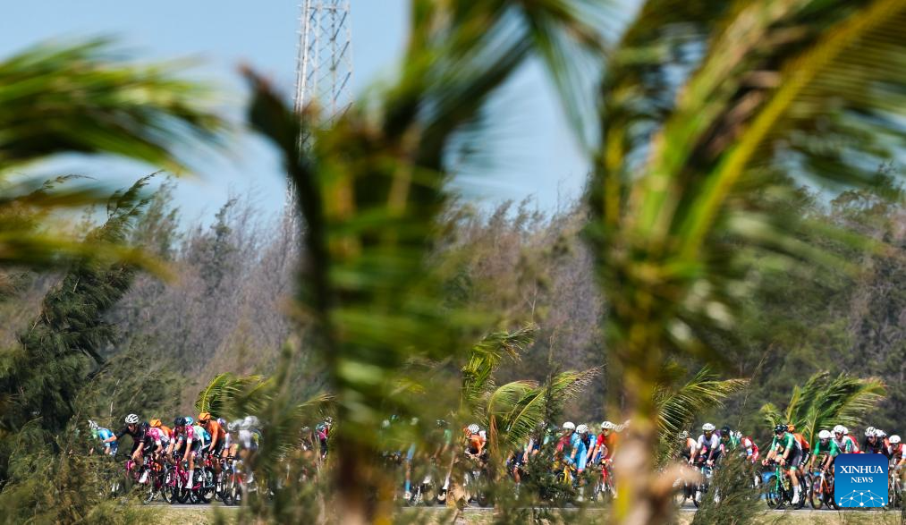 Cyclists compete during Stage 5 at the 16th Tour of Hainan cycling race from Dongfang to Sanya, south China's Hainan Province, April 11, 2025. (Xinhua/Yang Guanyu)