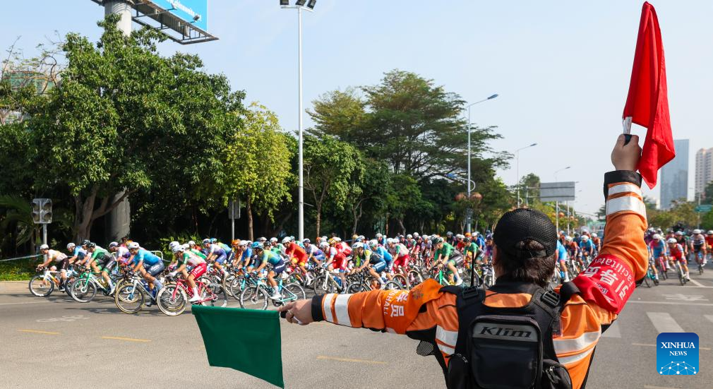 A facilitator guides cyclists during Stage 5 at the 16th Tour of Hainan cycling race from Dongfang to Sanya, south China's Hainan Province, April 11, 2025. (Xinhua/Yang Guanyu)