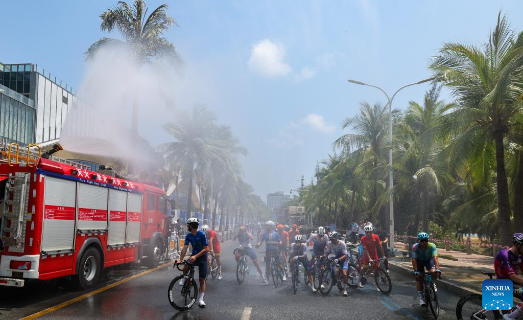 Cyclists cool down in mist after Stage 5 at the 16th Tour of Hainan cycling race from Dongfang to Sanya, south China's Hainan Province, April 11, 2025. (Xinhua/Yang Guanyu)
