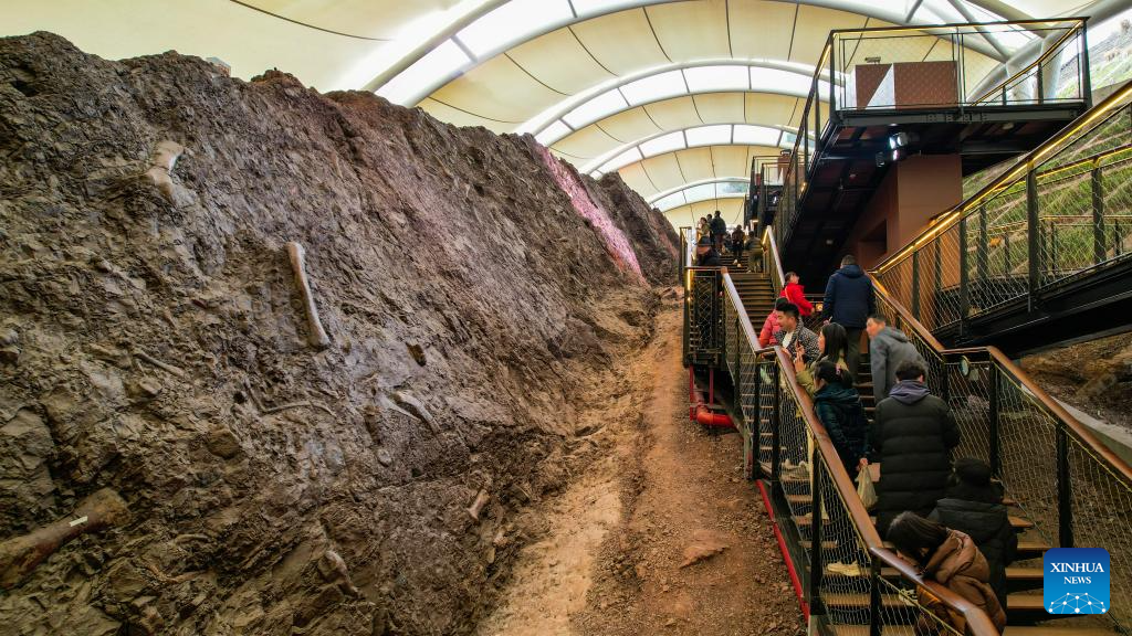 A drone photo taken on Jan. 30, 2025 shows tourists viewing a wall burying dinosaur fossils in the Yunyang Geopark in southwest China's Chongqing Municipality. (Xinhua)