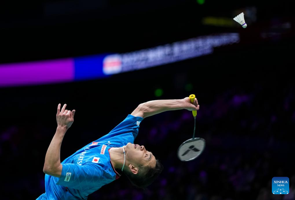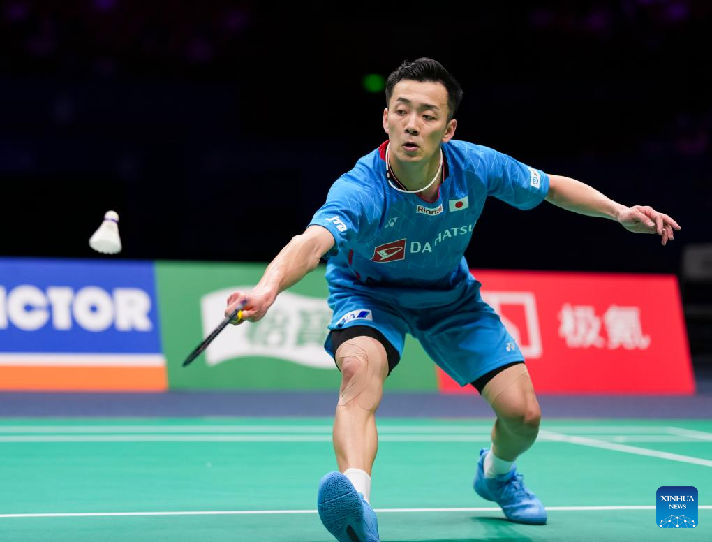 Nishimoto Kenta of Japan hits a return during the men's singles quarterfinal against Kunlavut Vitidsarn of Thailand at Badminton Asia Championships 2025 in Ningbo, east China's Zhejiang Province, April 11, 2025. (Xinhua/Sun Fei)