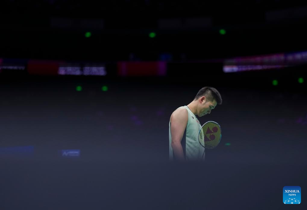 Kunlavut Vitidsarn of Thailand reacts during the men's singles quarterfinal against Nishimoto Kenta of Japan at Badminton Asia Championships 2025 in Ningbo, east China's Zhejiang Province, April 11, 2025. (Xinhua/Sun Fei)