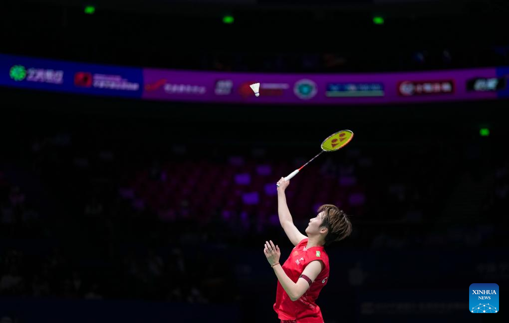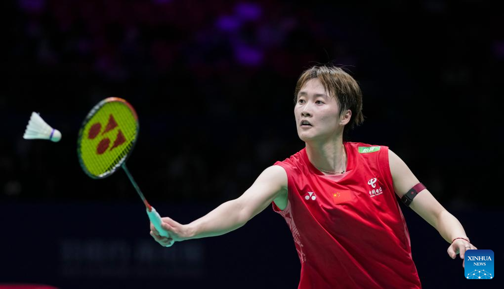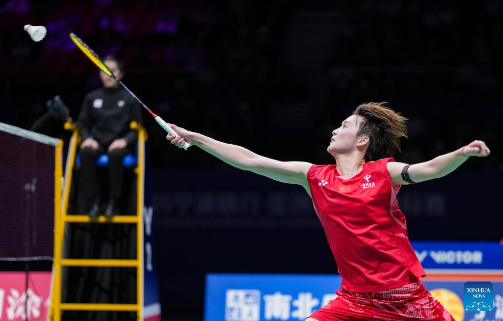 Chen Yufei of China hits a return during the women's singles quarterfinal against Yamaguchi Akane of Japan at Badminton Asia Championships 2025 in Ningbo, east China's Zhejiang Province, April 11, 2025. (Xinhua/Sun Fei)