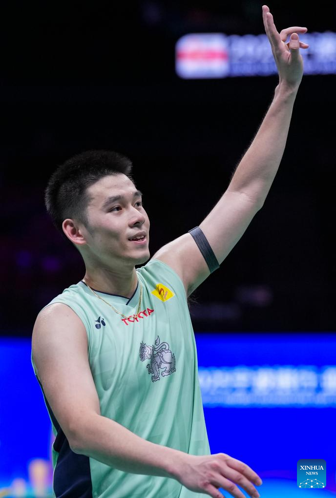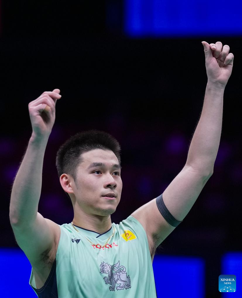 Kunlavut Vitidsarn of Thailand celebrates after the men's singles quarterfinal against Nishimoto Kenta of Japan at Badminton Asia Championships 2025 in Ningbo, east China's Zhejiang Province, April 11, 2025. (Xinhua/Sun Fei)