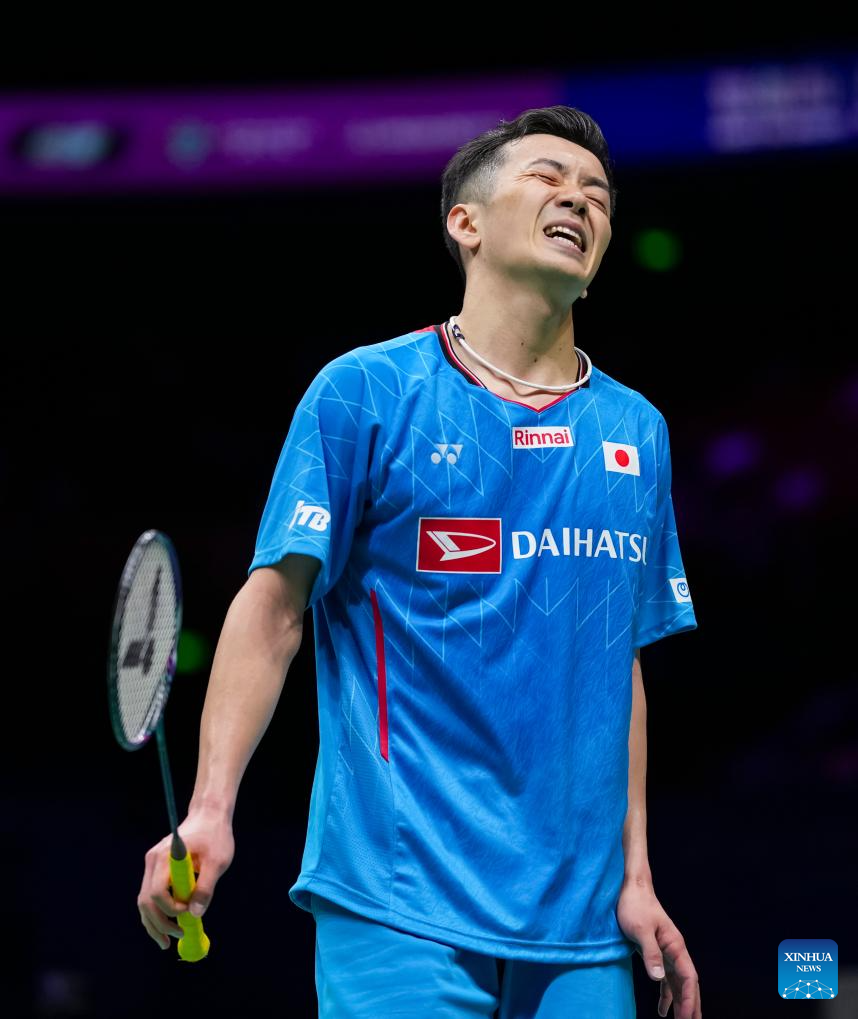 Nishimoto Kenta of Japan reacts during the men's singles quarterfinal against Kunlavut Vitidsarn of Thailand at Badminton Asia Championships 2025 in Ningbo, east China's Zhejiang Province, April 11, 2025. (Xinhua/Sun Fei)