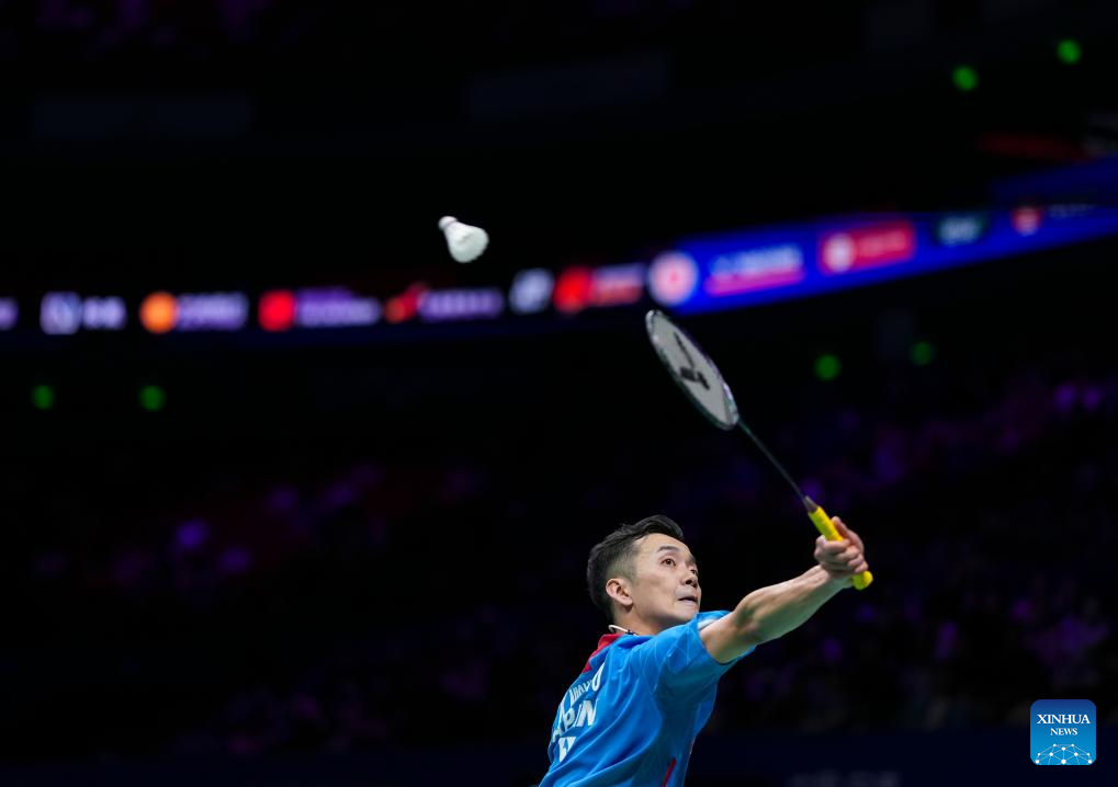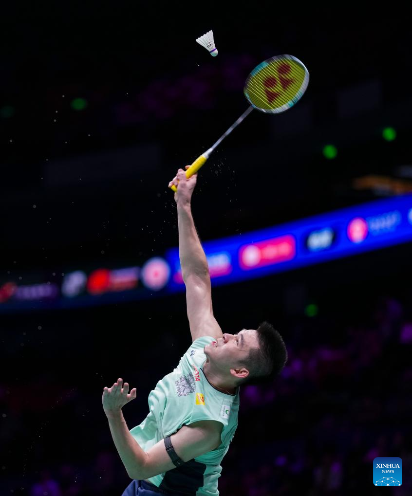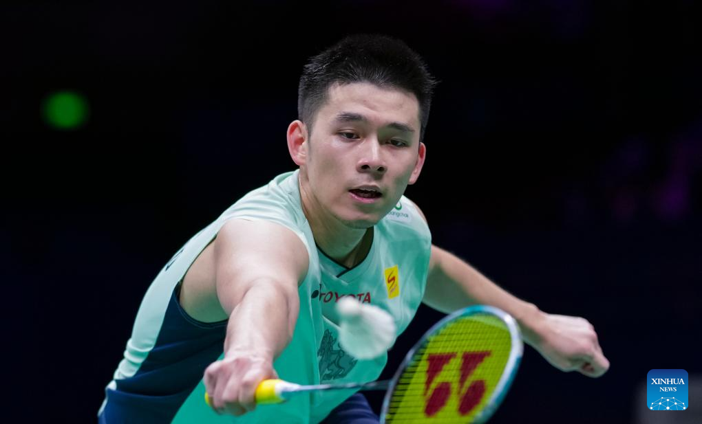 Kunlavut Vitidsarn of Thailand hits a return during the men's singles quarterfinal against Nishimoto Kenta of Japan at Badminton Asia Championships 2025 in Ningbo, east China's Zhejiang Province, April 11, 2025. (Xinhua/Sun Fei)