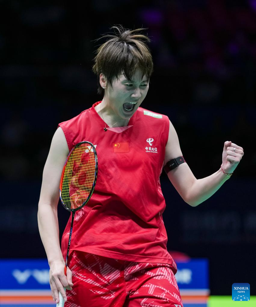 Chen Yufei of China celebrates after the women's singles quarterfinal against Yamaguchi Akane of Japan at Badminton Asia Championships 2025 in Ningbo, east China's Zhejiang Province, April 11, 2025. (Xinhua/Sun Fei)