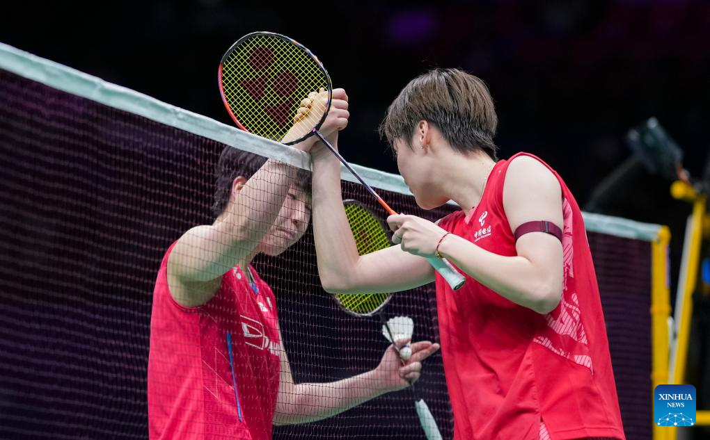 Chen Yufei (R) of China shakes hands with Yamaguchi Akane of Japan after the women's singles quarterfinal at Badminton Asia Championships 2025 in Ningbo, east China's Zhejiang Province, April 11, 2025. (Xinhua/Sun Fei)