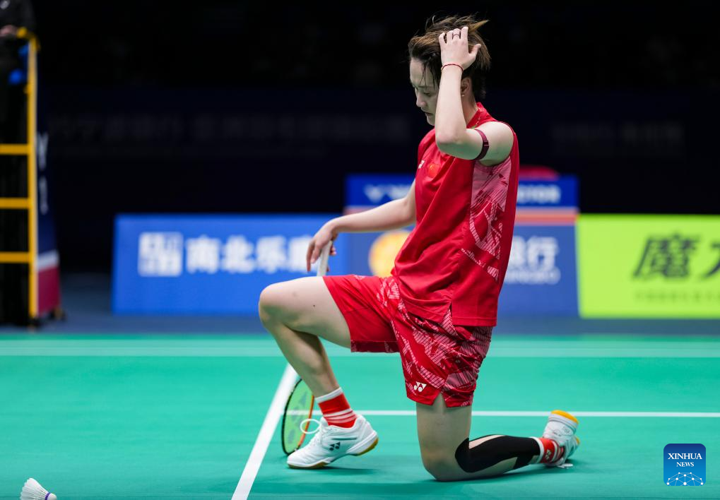 Chen Yufei of China reacts during the women's singles quarterfinal against Yamaguchi Akane of Japan at Badminton Asia Championships 2025 in Ningbo, east China's Zhejiang Province, April 11, 2025. (Xinhua/Sun Fei)