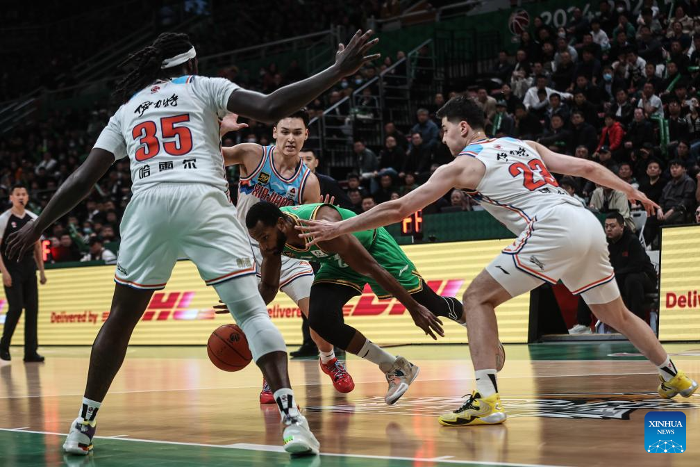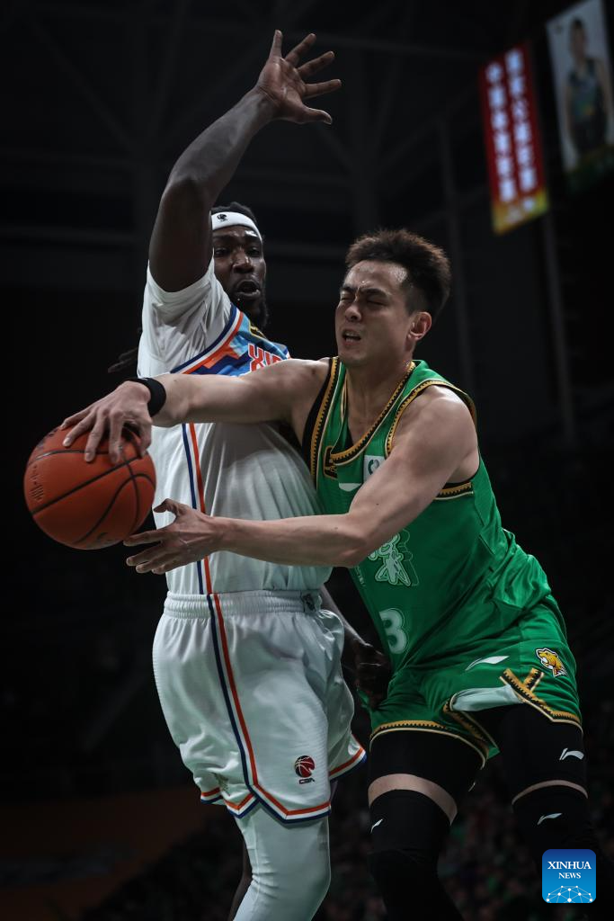 Kyle Fogg (2nd R) of Liaoning Flying Leopards breaks through during the playoff 2nd round match between Liaoning Flying Leopards and Xinjiang Flying Tigers at the 2024-2025 season of the Chinese Basketball Association (CBA) league in Shenyang, northeast China's Liaoning Province, April 13, 2025. (Xinhua/Pan Yulong)
