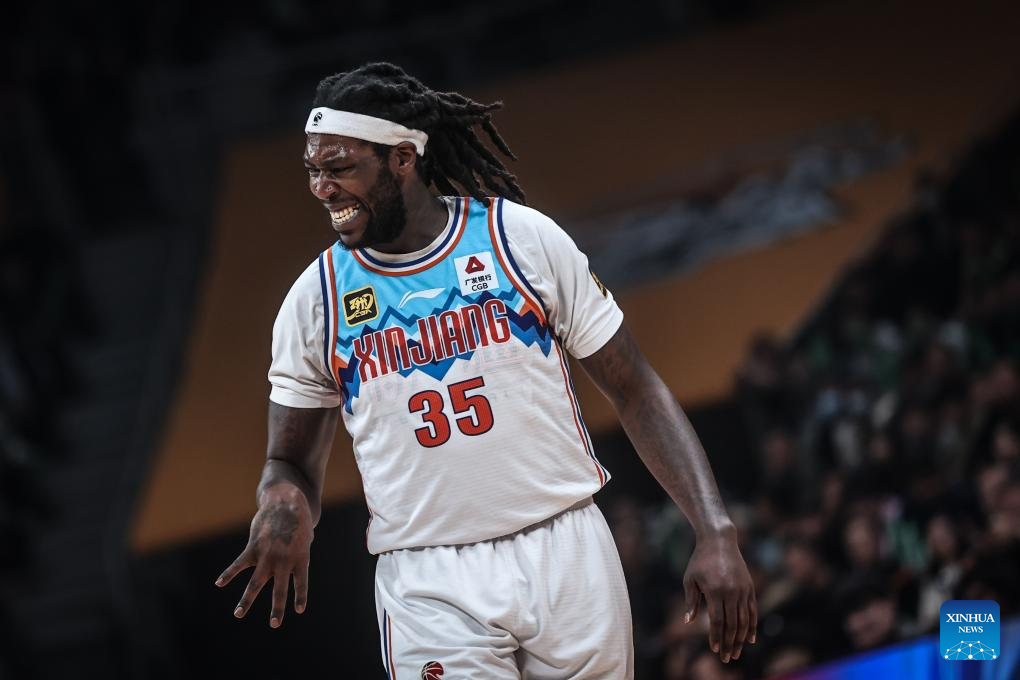 Montrezl Harrell of Xinjiang Flying Tigers reacts during the playoff 2nd round match between Liaoning Flying Leopards and Xinjiang Flying Tigers at the 2024-2025 season of the Chinese Basketball Association (CBA) league in Shenyang, northeast China's Liaoning Province, April 13, 2025. (Xinhua/Pan Yulong)