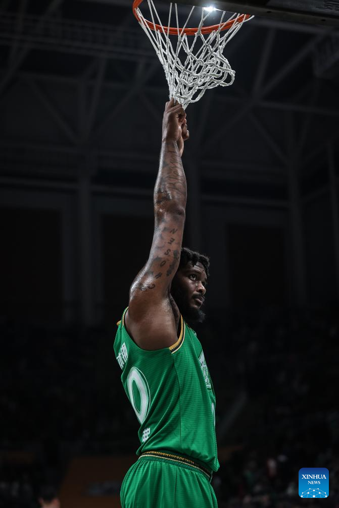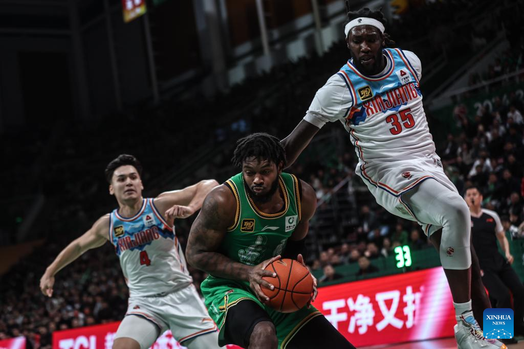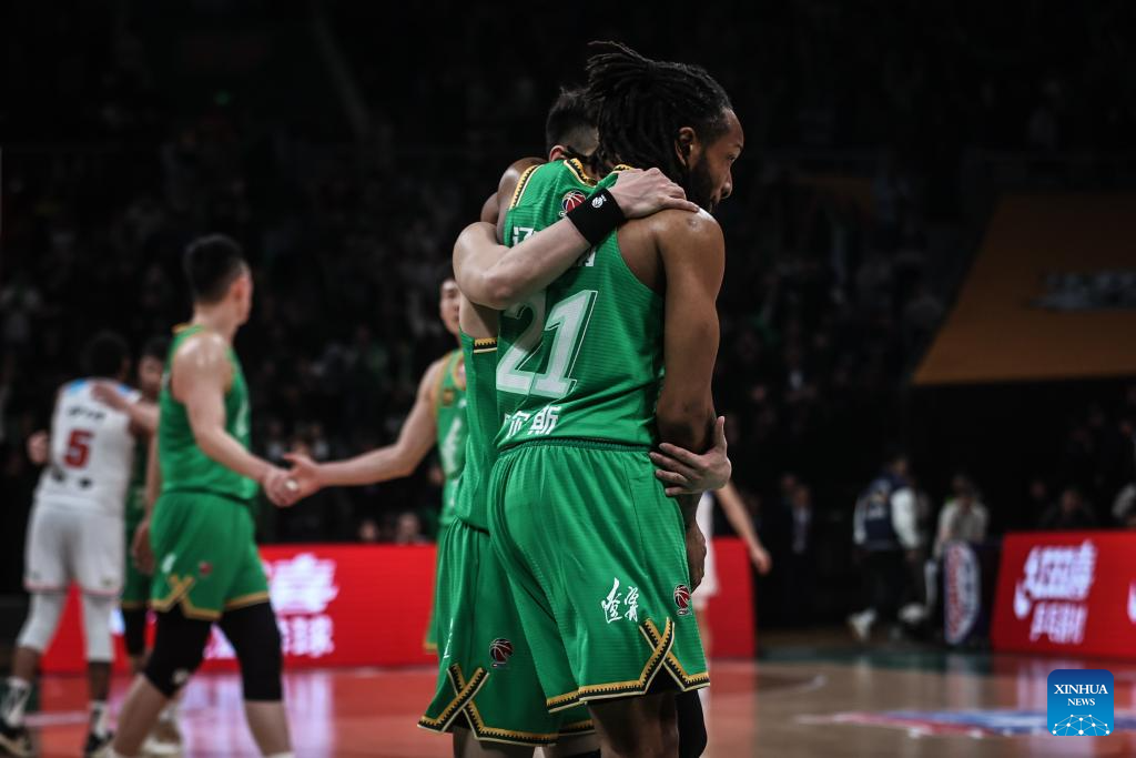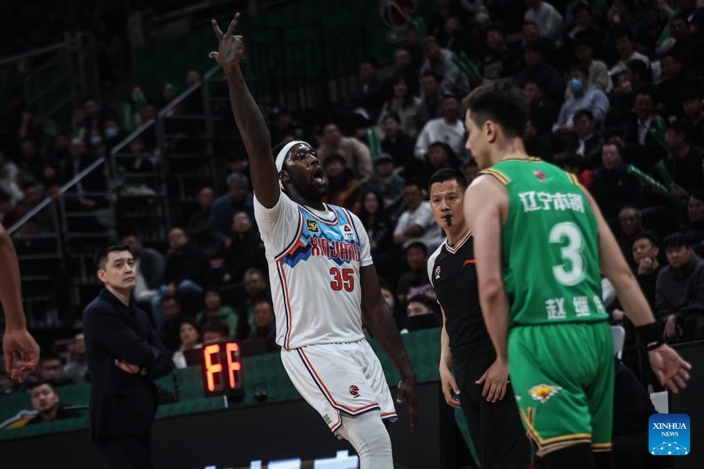 Montrezl Harrell (2nd L) of Xinjiang Flying Tigers celebrates scoring during the playoff 2nd round match between Liaoning Flying Leopards and Xinjiang Flying Tigers at the 2024-2025 season of the Chinese Basketball Association (CBA) league in Shenyang, northeast China's Liaoning Province, April 13, 2025. (Xinhua/Pan Yulong)