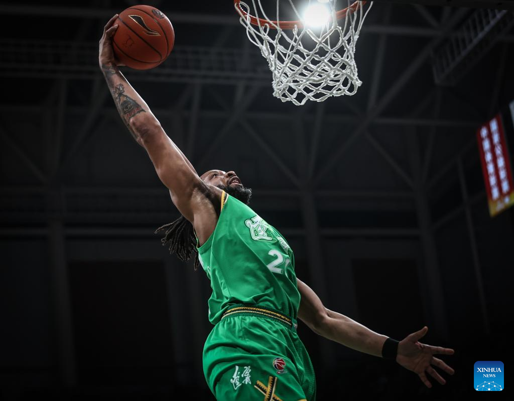 Dezmine Wells of Liaoning Flying Leopards dunks during the playoff 2nd round match between Liaoning Flying Leopards and Xinjiang Flying Tigers at the 2024-2025 season of the Chinese Basketball Association (CBA) league in Shenyang, northeast China's Liaoning Province, April 13, 2025. (Xinhua/Pan Yulong)