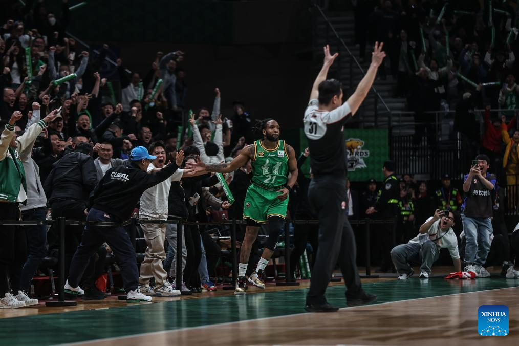 Dezmine Wells (C) of Liaoning Flying Leopards celebrates scoring during the playoff 2nd round match between Liaoning Flying Leopards and Xinjiang Flying Tigers at the 2024-2025 season of the Chinese Basketball Association (CBA) league in Shenyang, northeast China's Liaoning Province, April 13, 2025. (Xinhua/Pan Yulong)