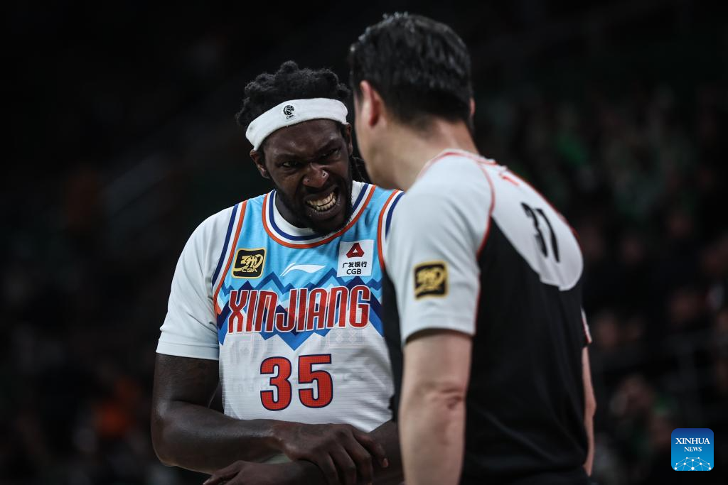 Montrezl Harrell (L) of Xinjiang Flying Tigers communicates with the referee during the playoff 2nd round match between Liaoning Flying Leopards and Xinjiang Flying Tigers at the 2024-2025 season of the Chinese Basketball Association (CBA) league in Shenyang, northeast China's Liaoning Province, April 13, 2025. (Xinhua/Pan Yulong)