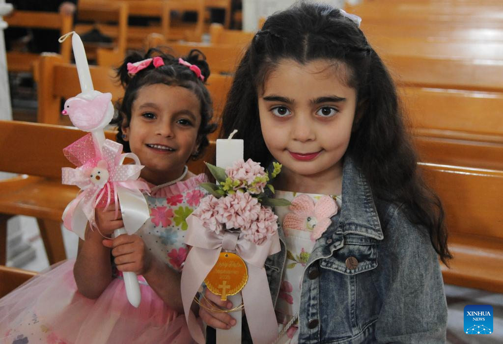 Girls hold decorated candles during Palm Sunday celebrations at a church in Damascus, Syria, April 13, 2025. Syrian Christians gathered in churches to mark Palm Sunday, a Christian feast that falls on Sunday ahead of Easter. (Photo by Ammar Safarjalani/Xinhua)