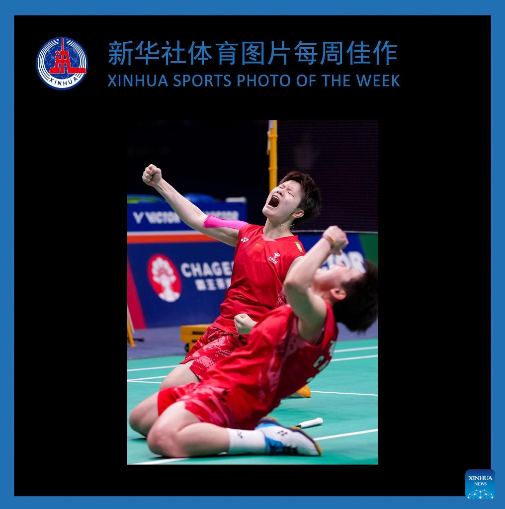 Liu Shengshu (back)/Tan Ning of China celebrate after winning the women's doubles final against Matsuyama Nami/Shida Chiharu of Japan at Badminton Asia Championships 2025 in Ningbo, east China's Zhejiang Province, April 13, 2025. (Xinhua/Sun Fei)
