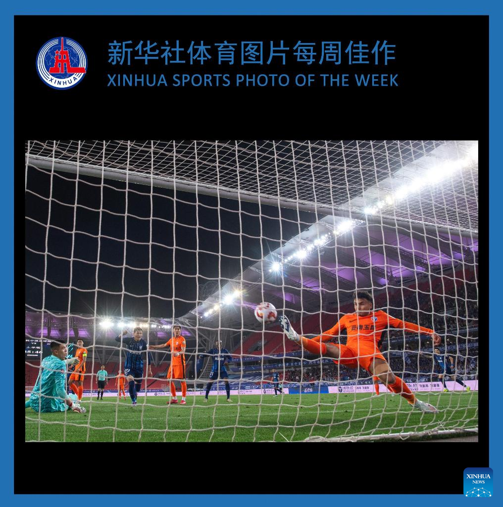 Dilmurat Mawlanniyaz (R) of Yunnan Yukun fails to save the ball during the 6th round match between Wuhan Three Towns FC and Yunnan Yukun at the 2025 season Chinese Football Super League (CSL) in Wuhan, central China's Hubei Province, April 12, 2025. (Xinhua/Xiao Yijiu)