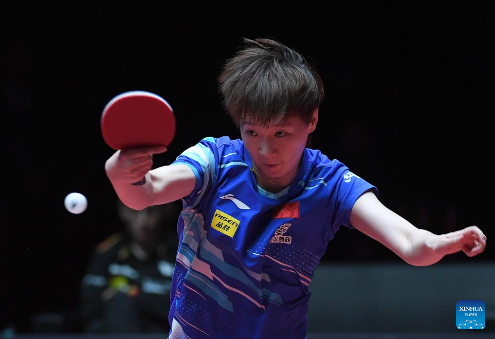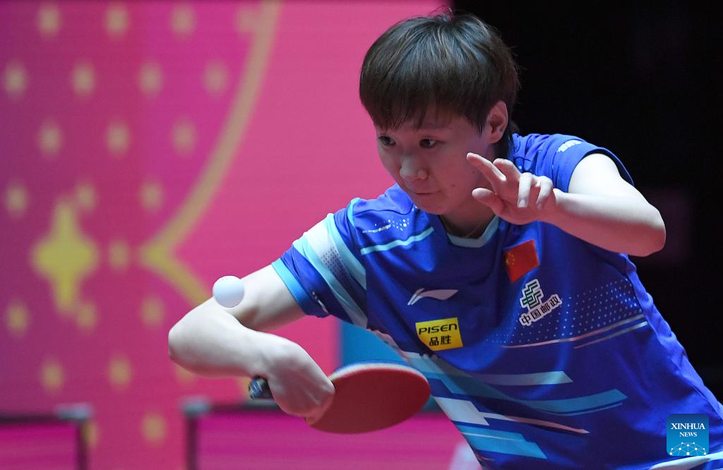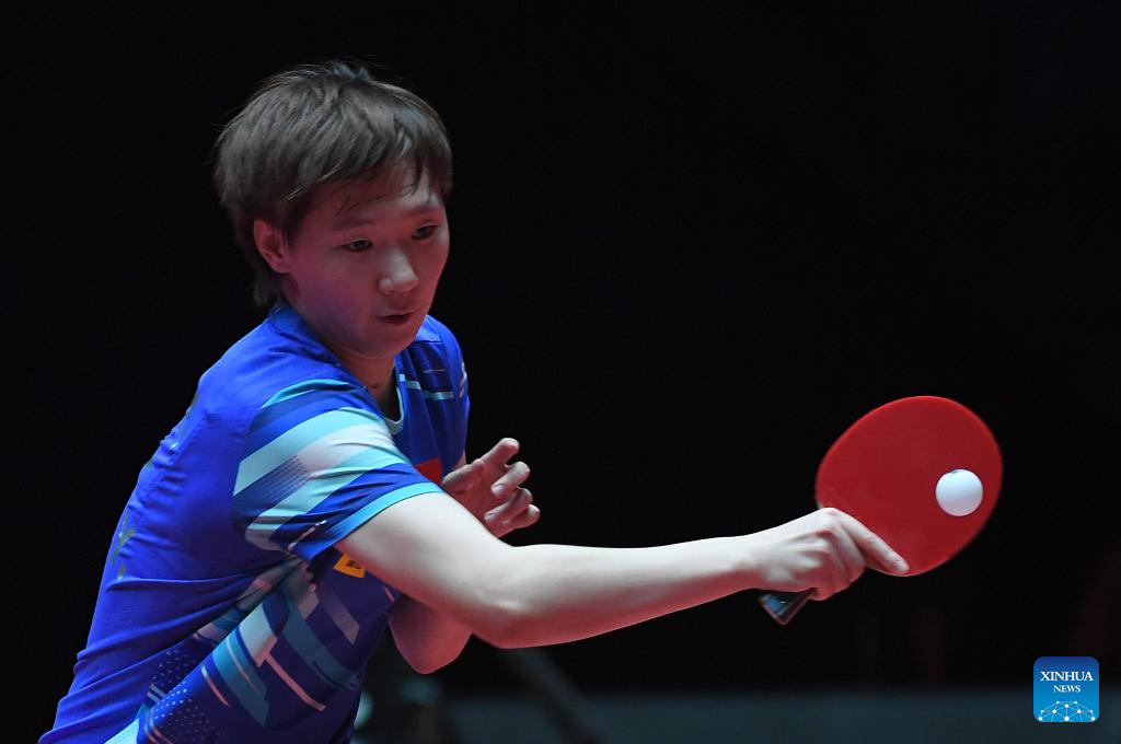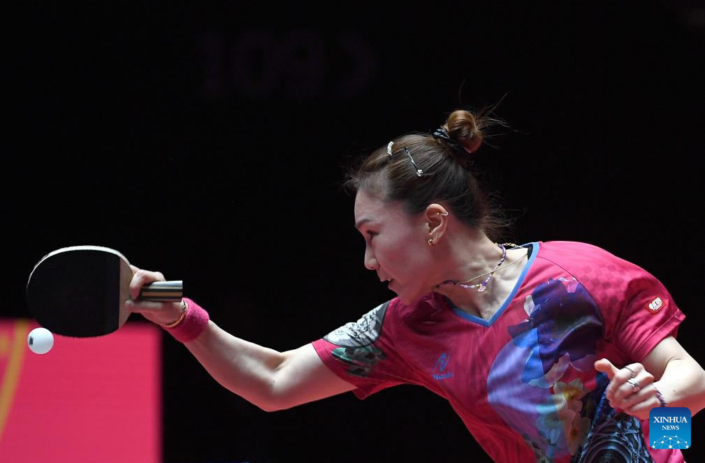 Shan Xiaona hits a return during the women's singles group match between Wang Manyu of China and Shan Xiaona of Germany at the ITTF Men's and Women's World Cup 2025 in Macao, China, April 16, 2025. (Xinhua/Chen Duo)