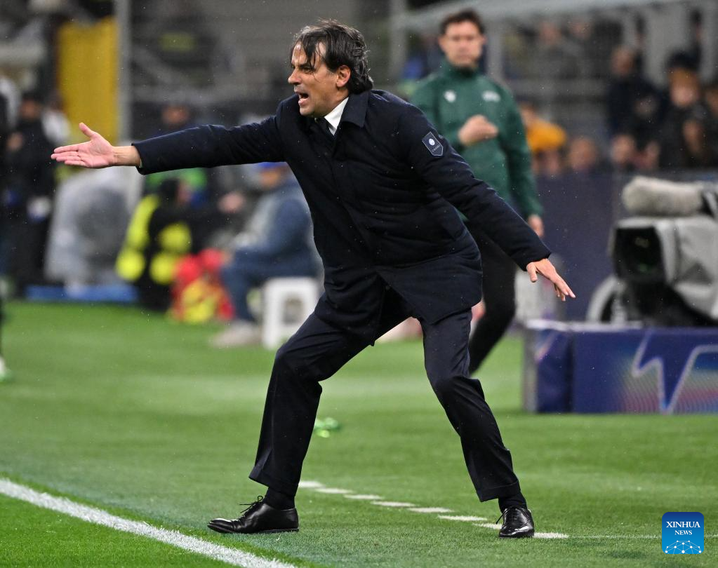 Inter Milan's head coach Simone Inzaghi instructs during the UEFA Champions League Quarterfinal 2nd leg match between Inter Milan and Bayern Munich in Milan, Italy, April 16, 2025. (Photo by Alberto Lingria/Xinhua)