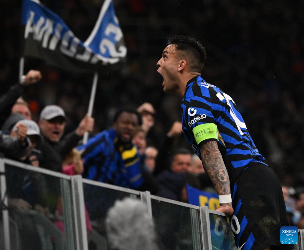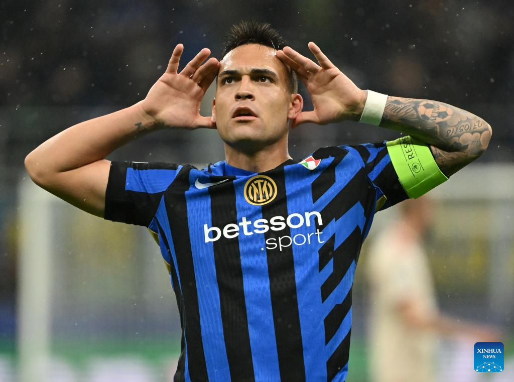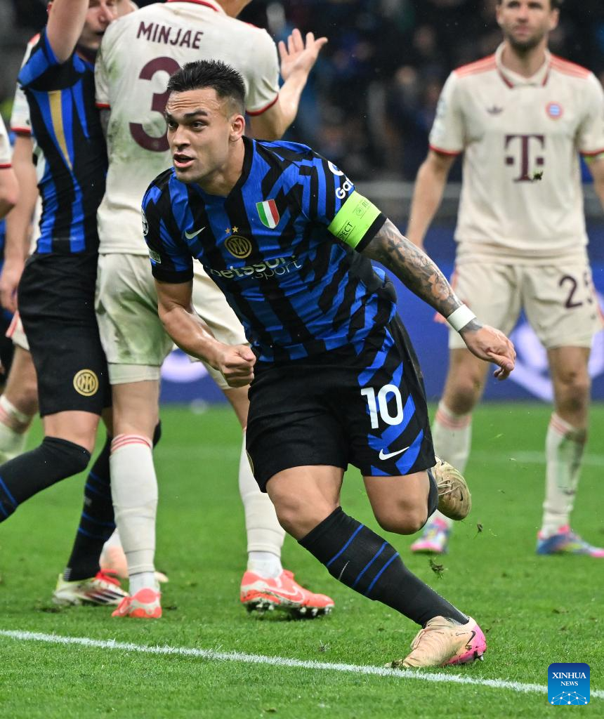 Inter Milan's Lautaro Martinez celebrates his goal during the UEFA Champions League Quarterfinal 2nd leg match between Inter Milan and Bayern Munich in Milan, Italy, April 16, 2025. (Photo by Alberto Lingria/Xinhua)
