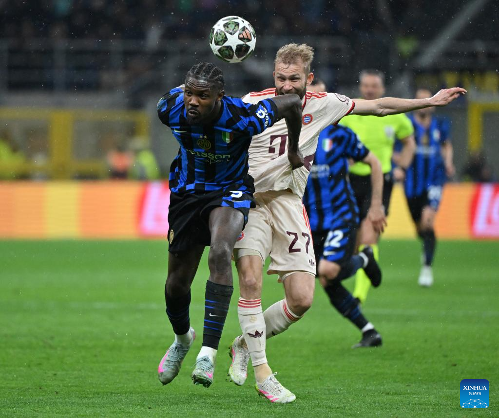 Inter Milan's Marcus Thuram (L) vies with Bayern Munich's Konrad Laimer during the UEFA Champions League Quarterfinal 2nd leg match between Inter Milan and Bayern Munich in Milan, Italy, April 16, 2025. (Photo by Alberto Lingria/Xinhua)