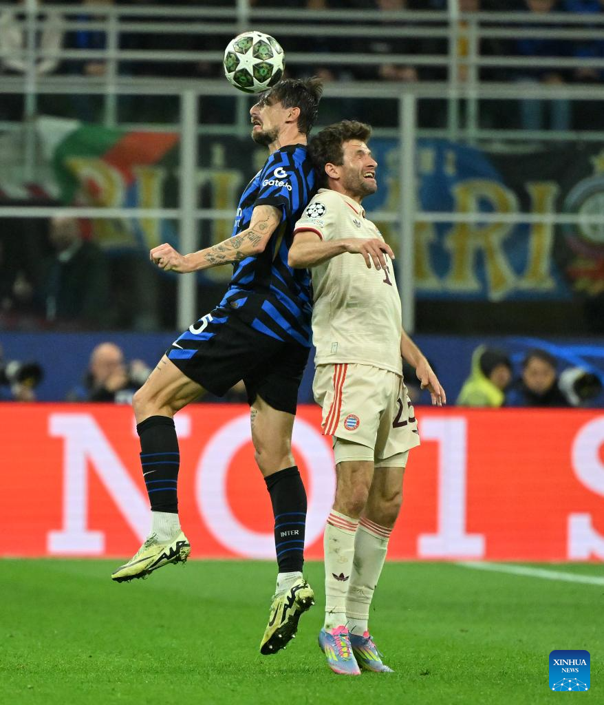 Inter Milan's Francesco Acerbi (L) vies with Bayern Munich's Thomas Muller during the UEFA Champions League Quarterfinal 2nd leg match between Inter Milan and Bayern Munich in Milan, Italy, April 16, 2025. (Photo by Alberto Lingria/Xinhua)