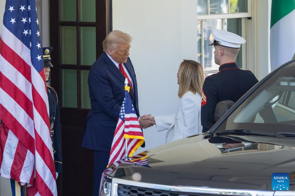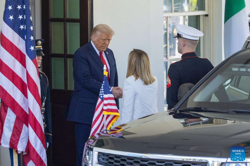 U.S. President Donald Trump (L) welcomes Italian Prime Minister Giorgia Meloni (C) at the White House in Washington, D.C., the United States, on April 17, 2025. Italian Prime Minister Giorgia Meloni met with U.S. President Donald Trump here on Thursday, with the tariff policy the main item on the agenda. (Xinhua/Hu Yousong)