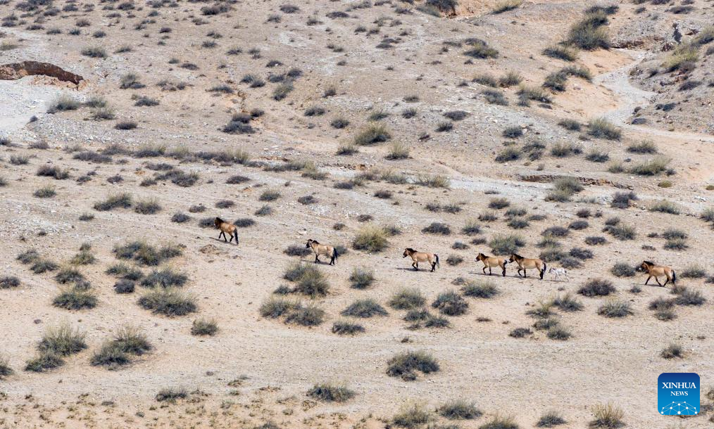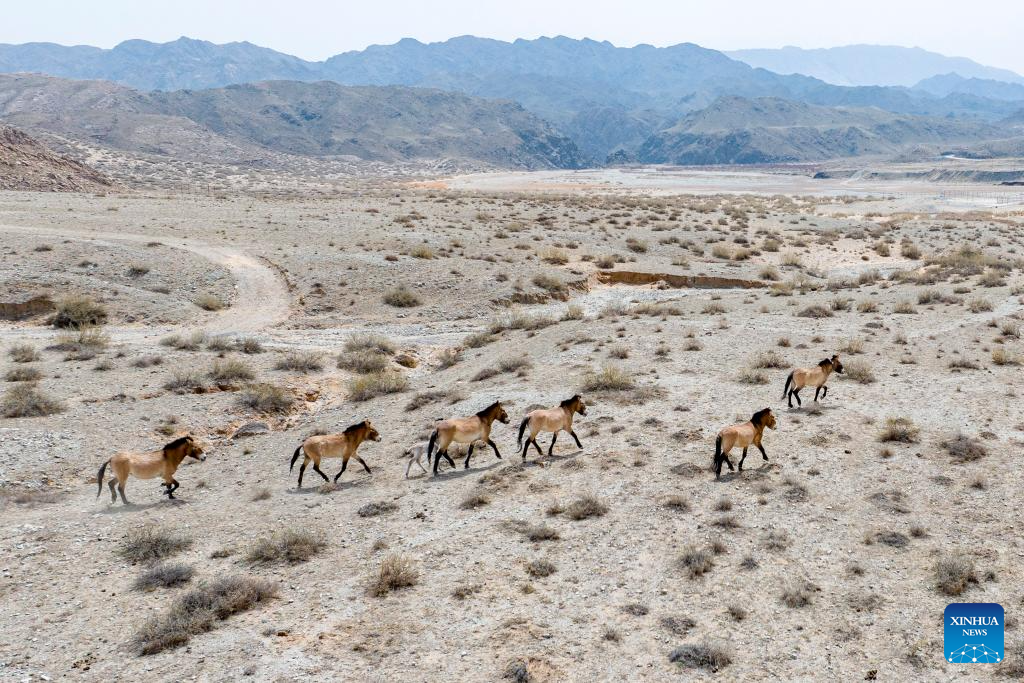 An aerial drone photo shows Przewalski's horses and a foal at the Helan Mountain Nature Reserve in northwest China's Ningxia Hui Autonomous Region, April 17, 2025. The Przewalski's horse is listed as endangered by the International Union for Conservation of Nature Red List of Threatened Species and is under first-class national protection.