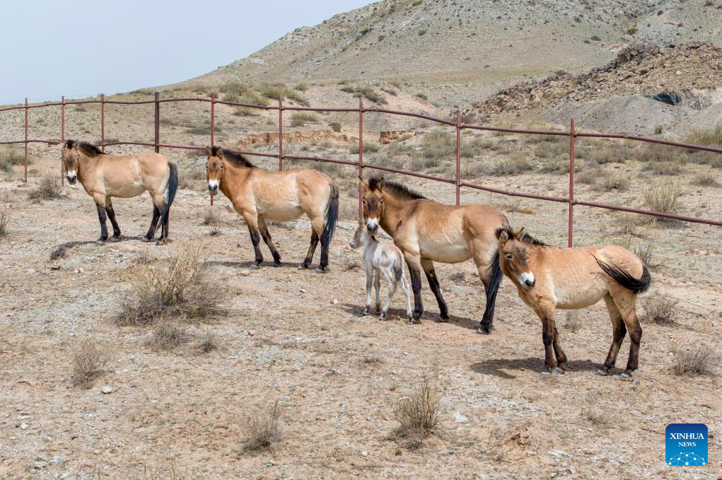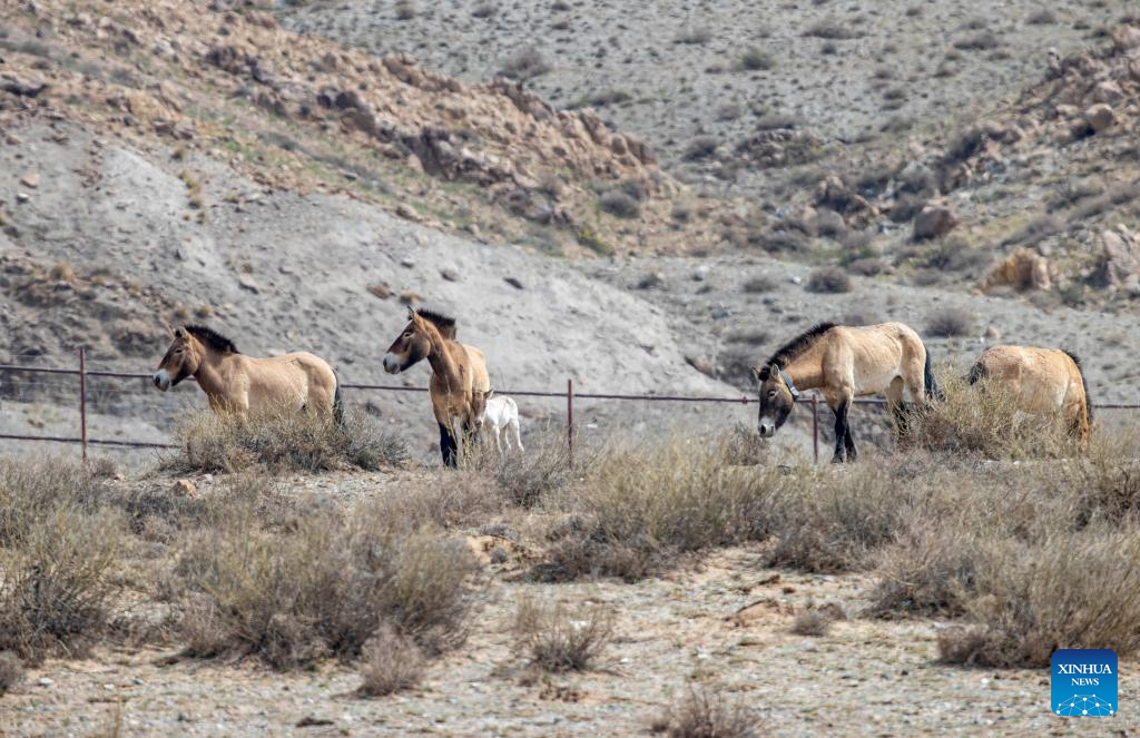 Przewalski's horses and a foal are seen at the Helan Mountain Nature Reserve in northwest China's Ningxia Hui Autonomous Region, April 17, 2025. The Przewalski's horse is listed as endangered by the International Union for Conservation of Nature Red List of Threatened Species and is under first-class national protection.