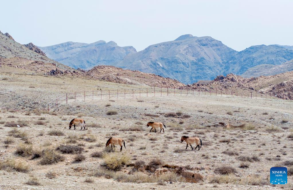 Przewalski's horses are seen at the Helan Mountain Nature Reserve in northwest China's Ningxia Hui Autonomous Region, April 17, 2025. The Przewalski's horse is listed as endangered by the International Union for Conservation of Nature Red List of Threatened Species and is under first-class national protection.