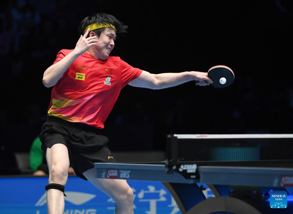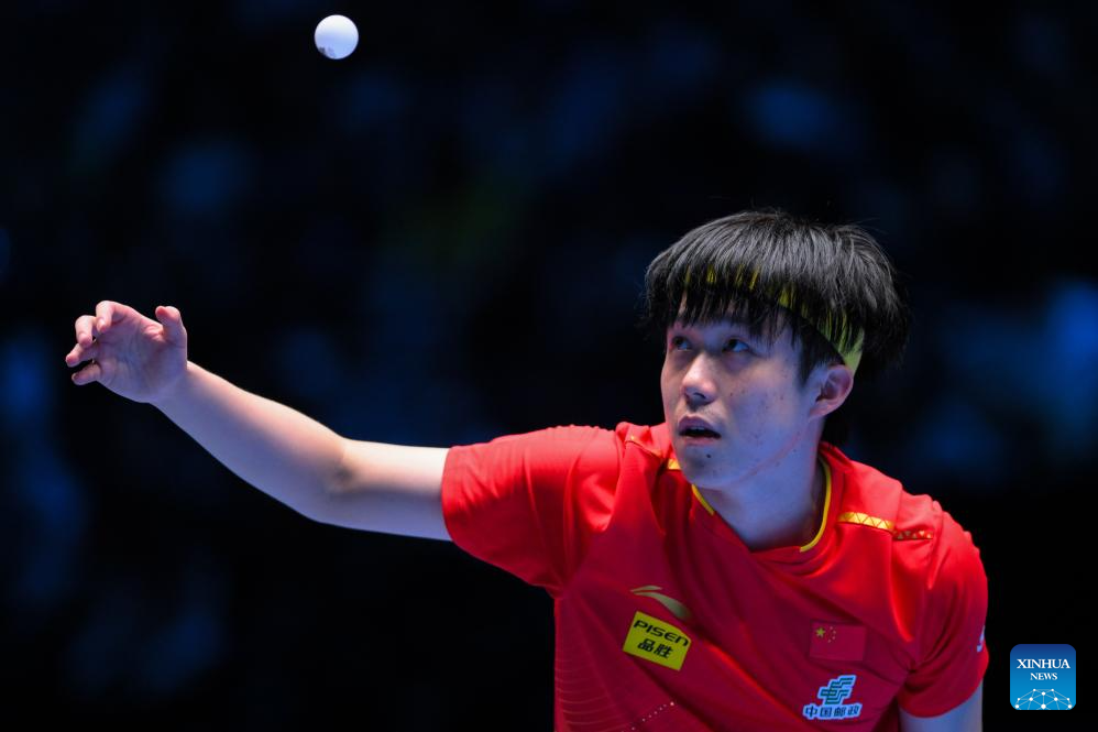 Wang Chuqin hits a return during the men's singles semifinal between Wang Chuqin of China and Hugo Calderano of Brazil at the ITTF Men's and Women's World Cup 2025 in Macao, China, April 19, 2025. (Xinhua/Chen Duo)