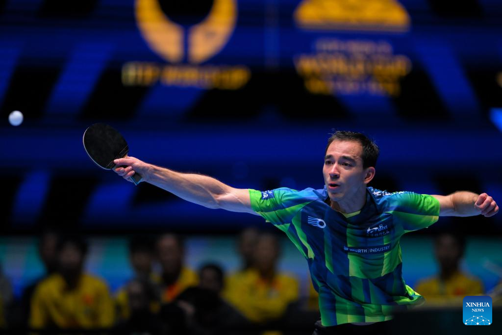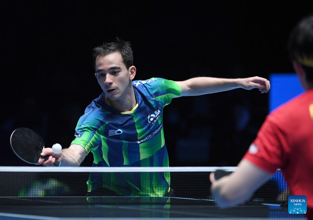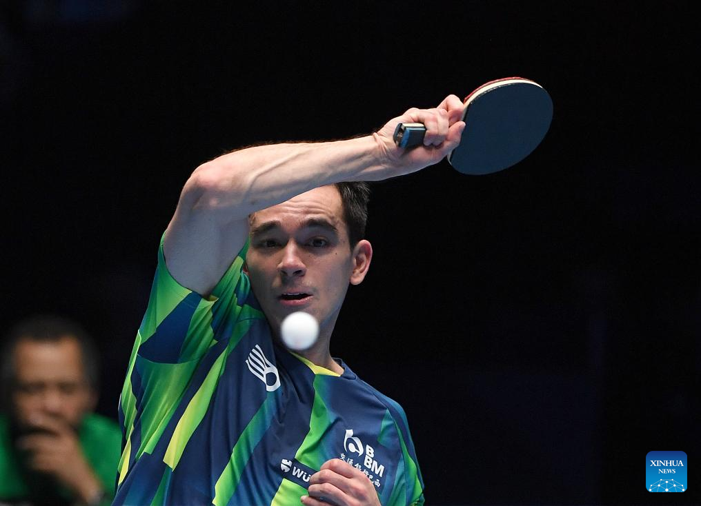 Hugo Calderano hits a return during the men's singles semifinal between Wang Chuqin of China and Hugo Calderano of Brazil at the ITTF Men's and Women's World Cup 2025 in Macao, China, April 19, 2025. (Xinhua/Chen Duo)