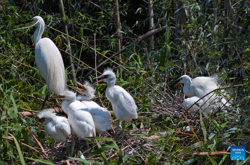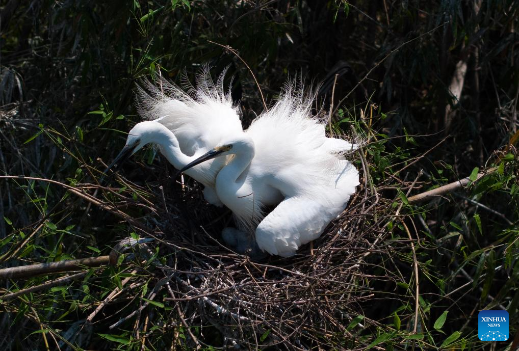 Two egrets take care of their newborn nestlings in Zhuxi Township, Dazu District of southwest China's Chongqing Municipality, April 20, 2025. This spring more than a thousand egrets have come to inhabit along the Laixi River in Zhuxi Township, a result of continuous ecological protection efforts of local government. The egrets, a manifestation of local ecological restoration, have added vigor and vitality here as well. (Xinhua/Chen Cheng)